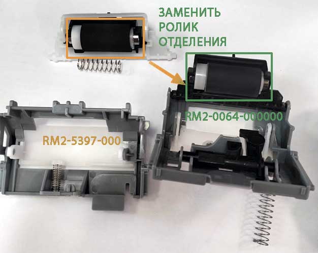 Цветные принтеры HP M553 весьма популярны в корпоративном секторе, но держать под них на складе ролики захвата и отделения нет смысла ввиду малой востребованности. Было принято решение подобрать ролики из наиболее ходовых позиций. Искать стали от аппаратов HP одной волны выпуска. С роликами захвата\отделения оказалось до банального просто: подошли резинки RM2-5452 для монохромного МФУ HP M426. Тут важно использовать резинки от известных поставщиков, где товар не залеживается, так как сами резинки имеют свойство от времени деградировать (терять эластичность). С роликом отделения оказалось немного сложнее. Из-за значительно емкости лотка тормозная площадка оказалась весьма высокой. Но и тут мы разобрались. В тормозной площадке изнашивается сам ролик, а корпус — нет. Поэтому идеально подошел сам ролик от тормозной площадки HP RM2-5397 для Hp M426. Нужно просто разобрать корпус и переставить тормозной ролик взамен изношенного. Износ тормозного ролика определяется достаточно просто: при захвате бумаги принтер издает неприятный рычащий звук. Если пользователи звук игнорируют, то потом на самой резинке ролика образуется горизонтальная проточка от ролика протяжки, и принтер перестает нормально захватывать бумагу. Если по поводу деградации резинки на ролике отделения можно особо не заморачиваться, то вот с пружиной на основании металлического стержня не все так просто. При прокручивании пальцем, тормозной ролик должен вращаться плавно и с усилием, но при этом не издавать скрипящего звука (конец пружины цепляется за металлическое основание, и ролик двигается рывками). К тому же, если ролик легко вращается, то он работать не будет. Каждый третий ролик приходится разбирать и доводить до ума, смазывать (речь идет про совместимые ролики, не про оригинал). От себя скажем, что не нужно экономить и всегда менять ролики комплектом, т.е. отделение\захват\протяжка. Это позволит улучшить захват бумаги на больших тиражах и стабилизировать работу аппарата.