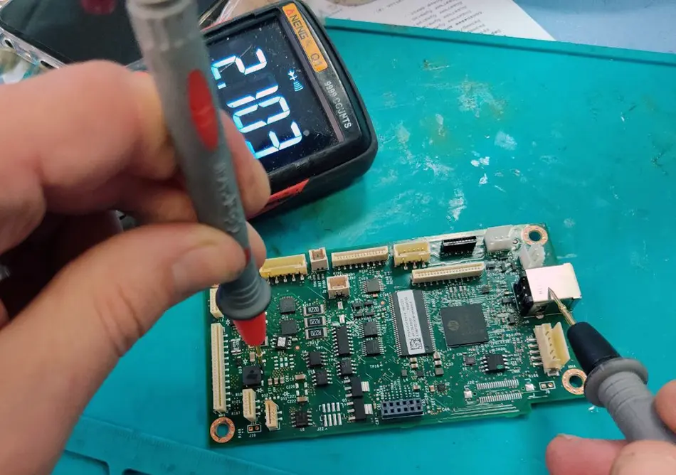 Дальнейшее исследование было сосредоточено на плате форматера (4RY26-60001). С помощью мультиметра в режиме прозвонки, который позволяет проверить целостность электрических цепей на обрыв или короткое замыкание, был обнаружен дефект. При подключении одного щупа к металлическому корпусу USB-разъема (который всегда соединен с общей землей) и второго щупа к контакту дросселя, мультиметр показал наличие короткого замыкания. Важно отметить, что в исправной плате, независимо от производителя, общая земля не должна прозваниваться накоротко с дросселями.