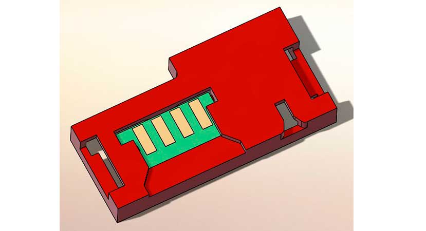 В принтерах и МФУ Xerox 6020/6025 / 6010 /6015 стартовые картриджи идут без чипов. Место в крышке картриджа закрывающей пробку нет отверстия под чип. Горе мастера пытаются вырезать эти отверстия, но это в большинстве случаев приводит к поломке контактов идущих на чип. Отдельно колодок для чипов в продаже нет. Нами была спроектирована колодка под чип, в качестве прототипа была использована колодка от совместимого картриджа. Чип надежно фиксируется в колодке при помощи защелок, как в оригинальных крышках.
