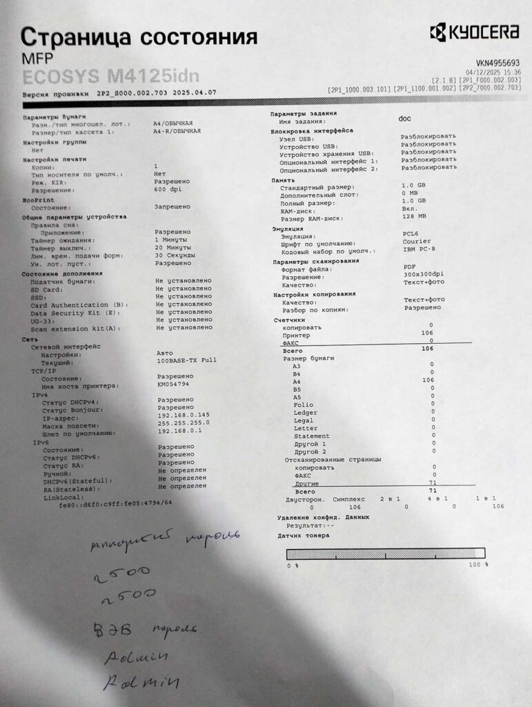 К нам в сервисный центр обратился коллега, который продал аппарат Kyocera M4125idn. Спустя короткий промежуток времени выяснилось, что в Kyocera M4125idn с версией прошивки 2P2_S000.002.703, выпущенной в 2025.04.07, содержит индивидуальные пароли, которые благополучно были утеряны. Обращение в техподдержку Kyocera выявило, что аппарат завезен по параллельному импорту и помочь со сбросом пароля они не могут. Попытка сброса из сервиса U024 ничего не дала, кроме сброса языка и прочего. Было принято решение понижения прошивки. Тут тоже оказалось не все так просто. В процессе подбора оптимальной версии прошивки несколько раз ловили весьма фатальные ошибки типа Code: 0060. В конце концов подошла прошивка версии 02.04.0020 (2022-06-15). С этой прошивкой аппарат получил стандартные пароли и успешно стартовал. (панель управления 2500\2500 и web Admin\Admin).